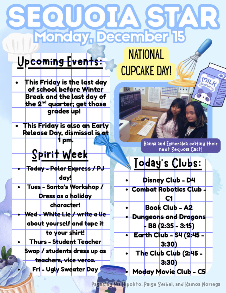 Sequoia's Daily Bulletin in produced and recorded daily by Ms Mangelsdorf's Bulletin Classes at Sequoia Middle School. The Bulletin is created in a learning environment, where students strive to be accurate and inclusive of the entire Sequoia Middle School community. Any mistakes or omissions are accidental.