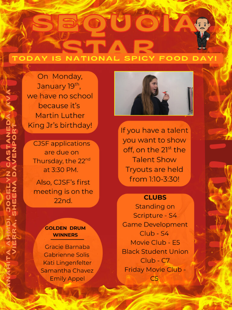 Sequoia's Daily Bulletin in produced and recorded daily by Ms Mangelsdorf's Bulletin Classes at Sequoia Middle School. The Bulletin is created in a learning environment, where students strive to be accurate and inclusive of the entire Sequoia Middle School community. Any mistakes or omissions are accidental.