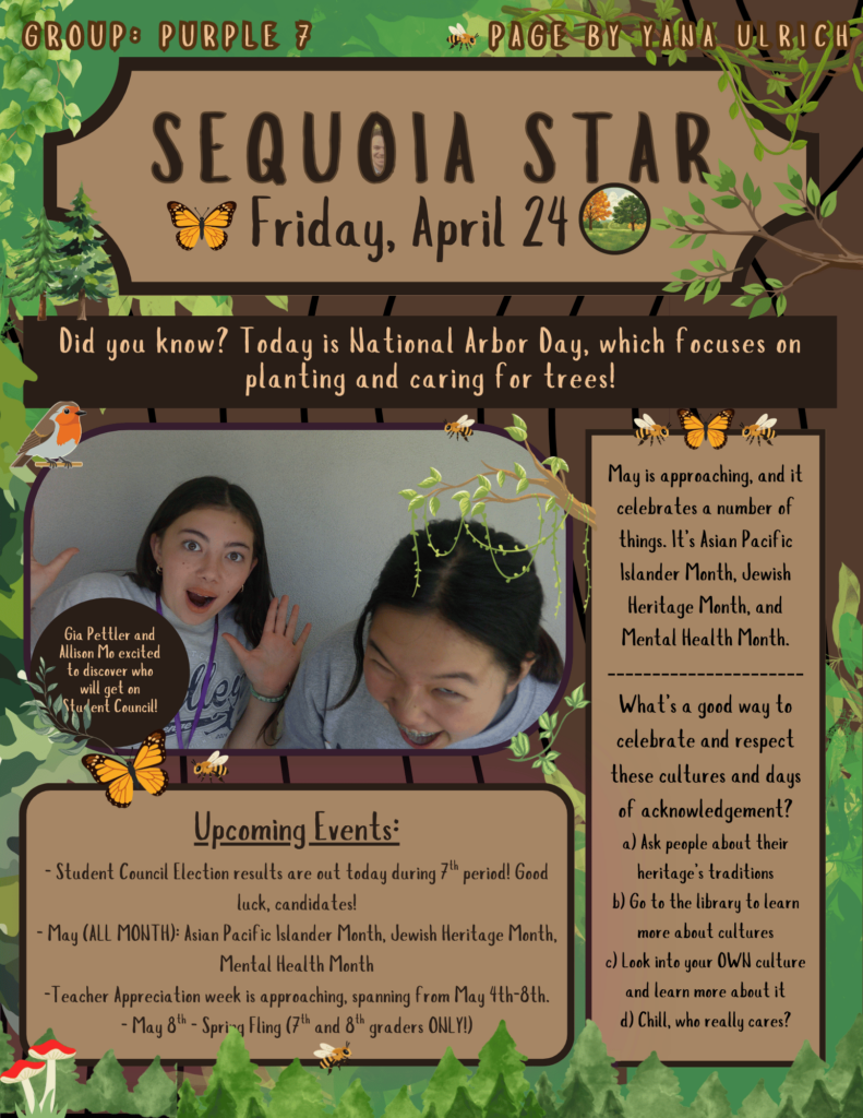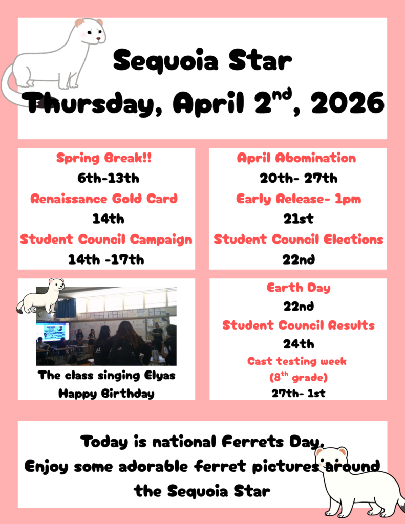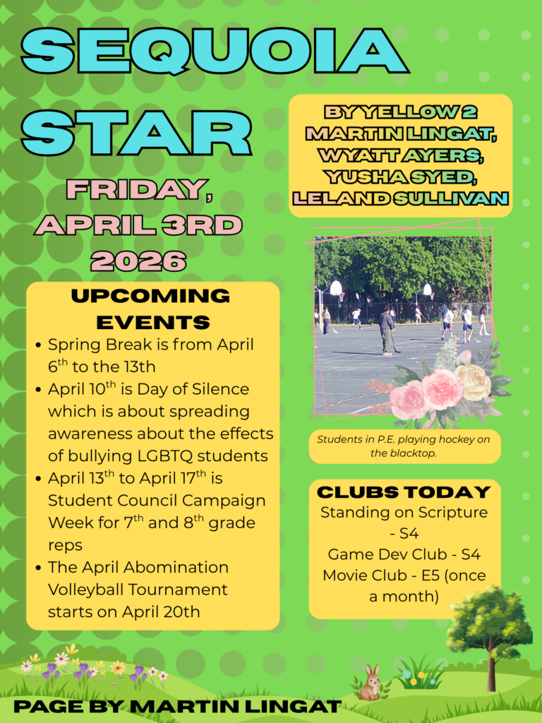Sequoia's Daily Bulletin in produced and recorded daily by Ms Mangelsdorf's Bulletin Classes at Sequoia Middle School. The Bulletin is created in a learning environment, where students strive to be accurate and inclusive of the entire Sequoia Middle School community. Any mistakes or omissions are accidental.