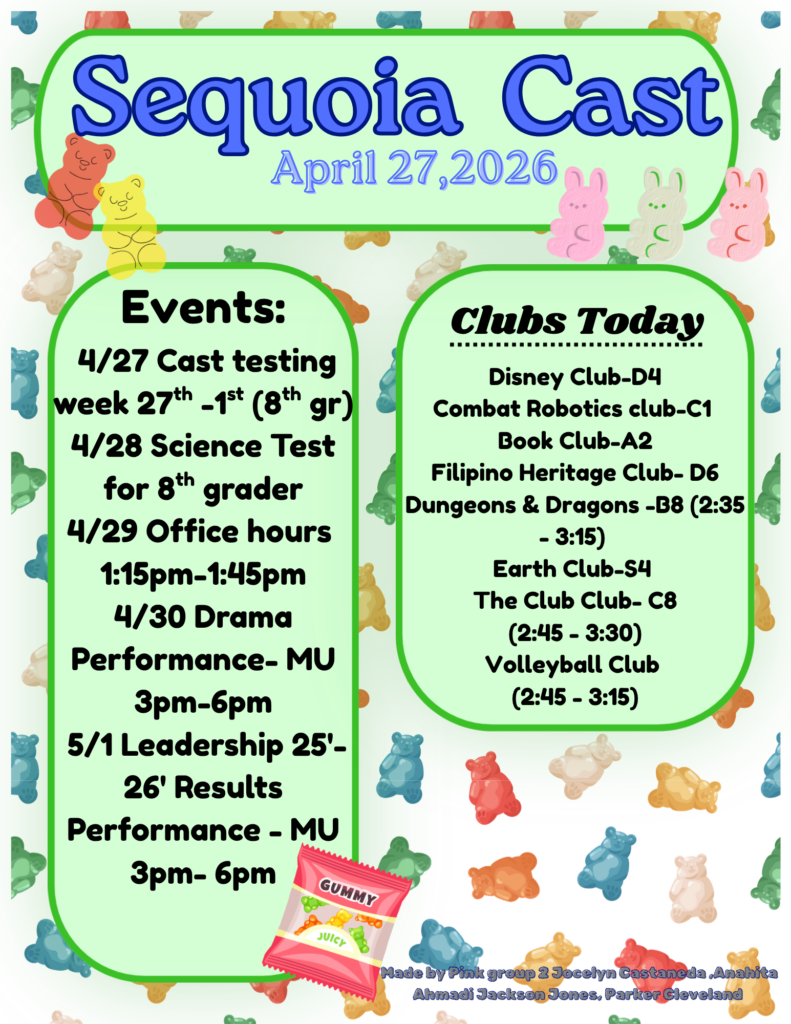 Sequoia's Daily Bulletin in produced and recorded daily by Ms Mangelsdorf's Bulletin Classes at Sequoia Middle School. The Bulletin is created in a learning environment, where students strive to be accurate and inclusive of the entire Sequoia Middle School community. Any mistakes or omissions are accidental.